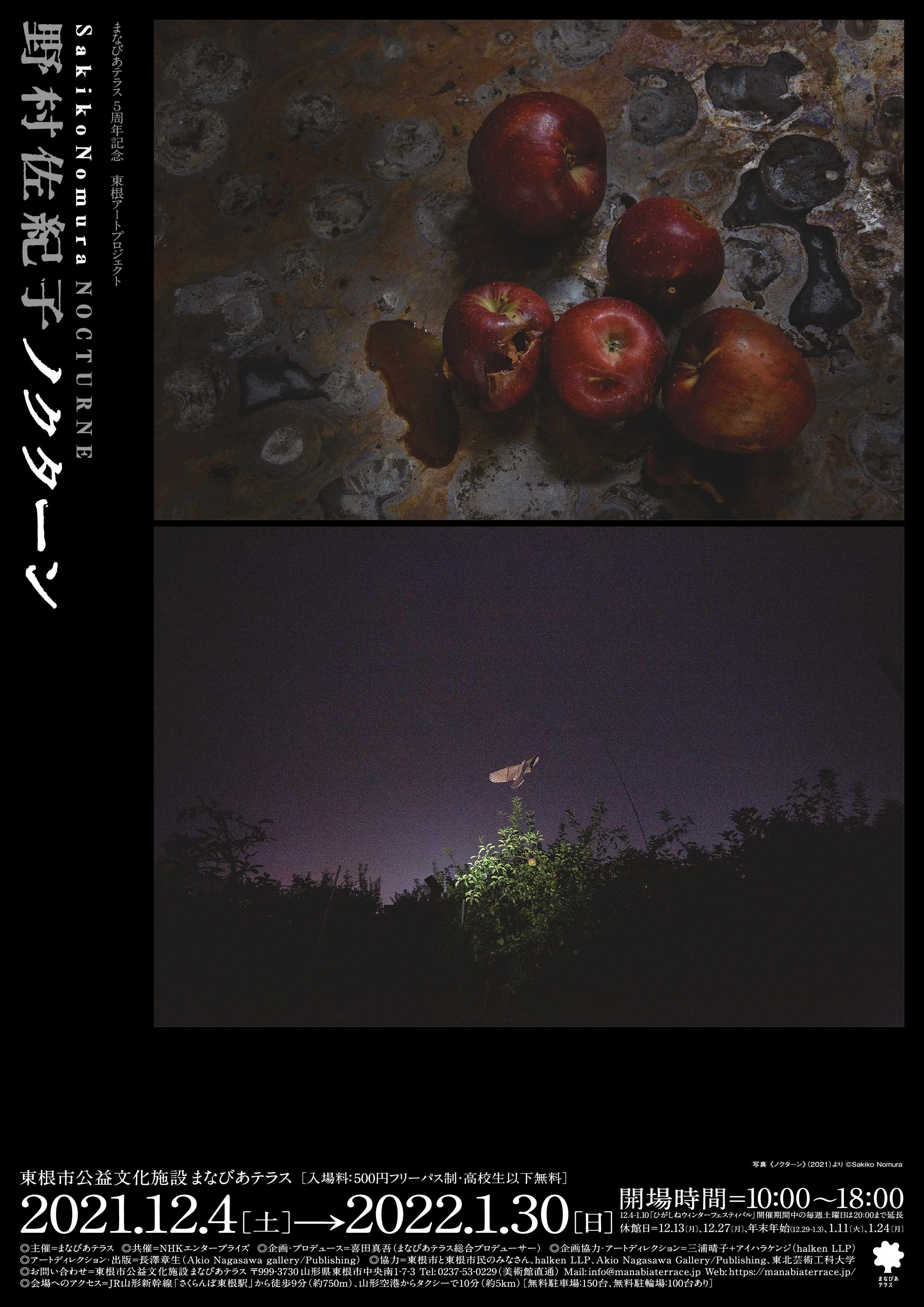 主催 まなびあテラス/共催 NHKエンタープライズ/協力 東根市と東根市民のみなさん、halken LLP、Akio Nagasawa Gallery/Publishing、東北芸術工科大学/企画・プロデュース 喜田真吾(まなびあテラス総合プロデューサー)/企画協力・アートディレクション 三浦晴子+アイハラケンジ(halken LLP)/アートディレクション・出版 長澤章生(Akio Nagasawa Gallery/Publishing)