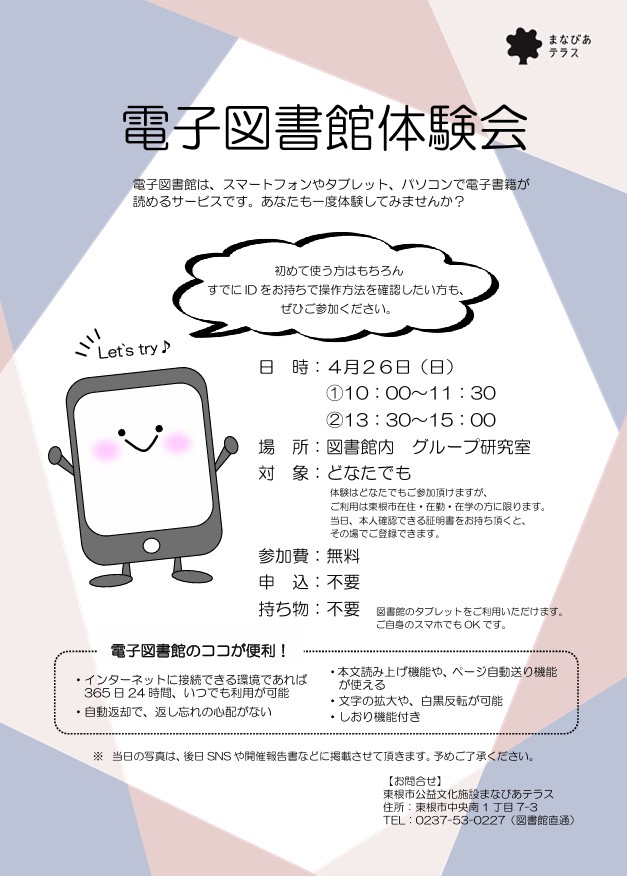 体験はどなたでもご参加頂けますが、ご利用は東根市在住・在勤・在学の方に限ります。