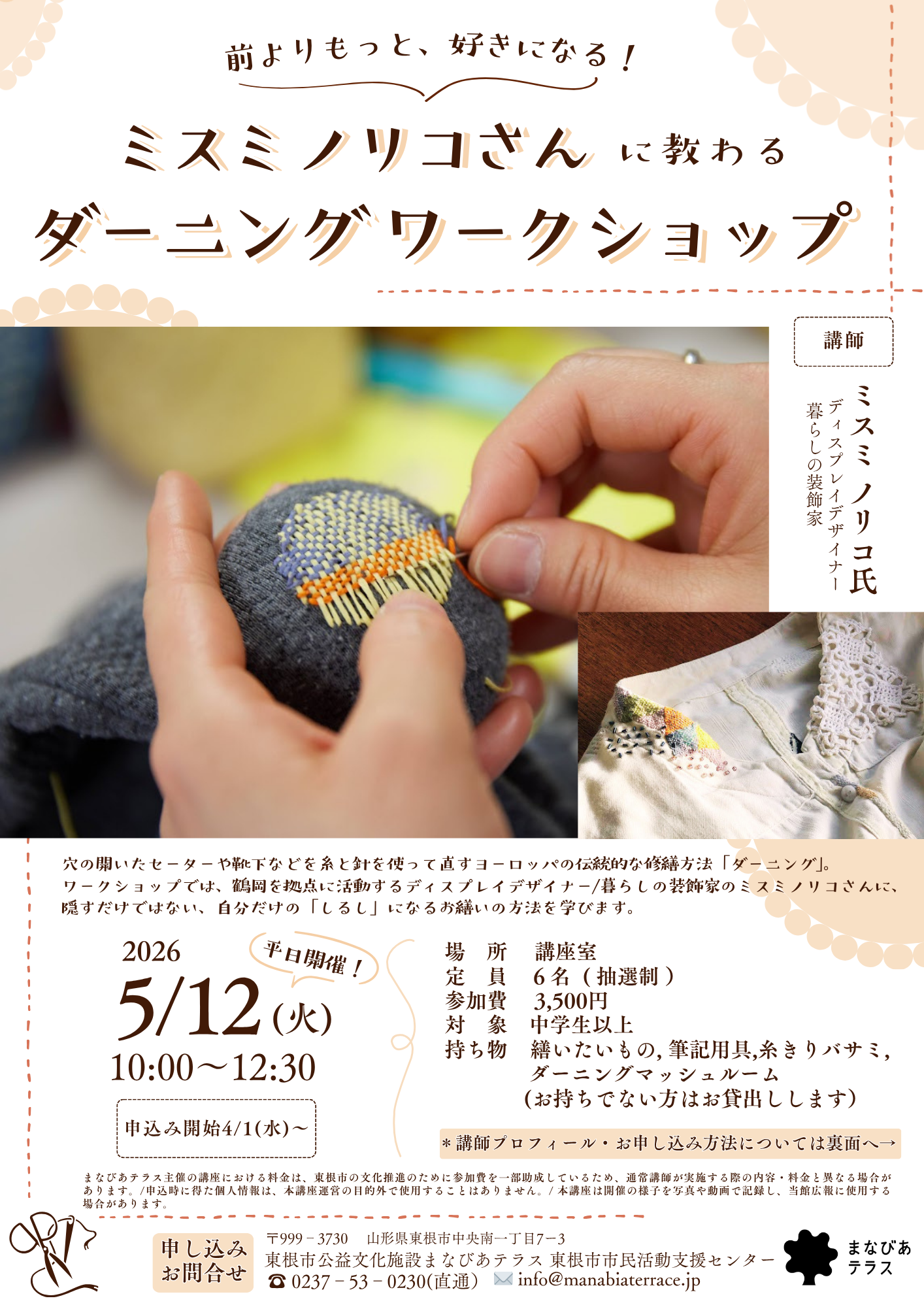 持ち物:繕いたいもの(穴の大きさ3センチ以内のニットや靴下など)