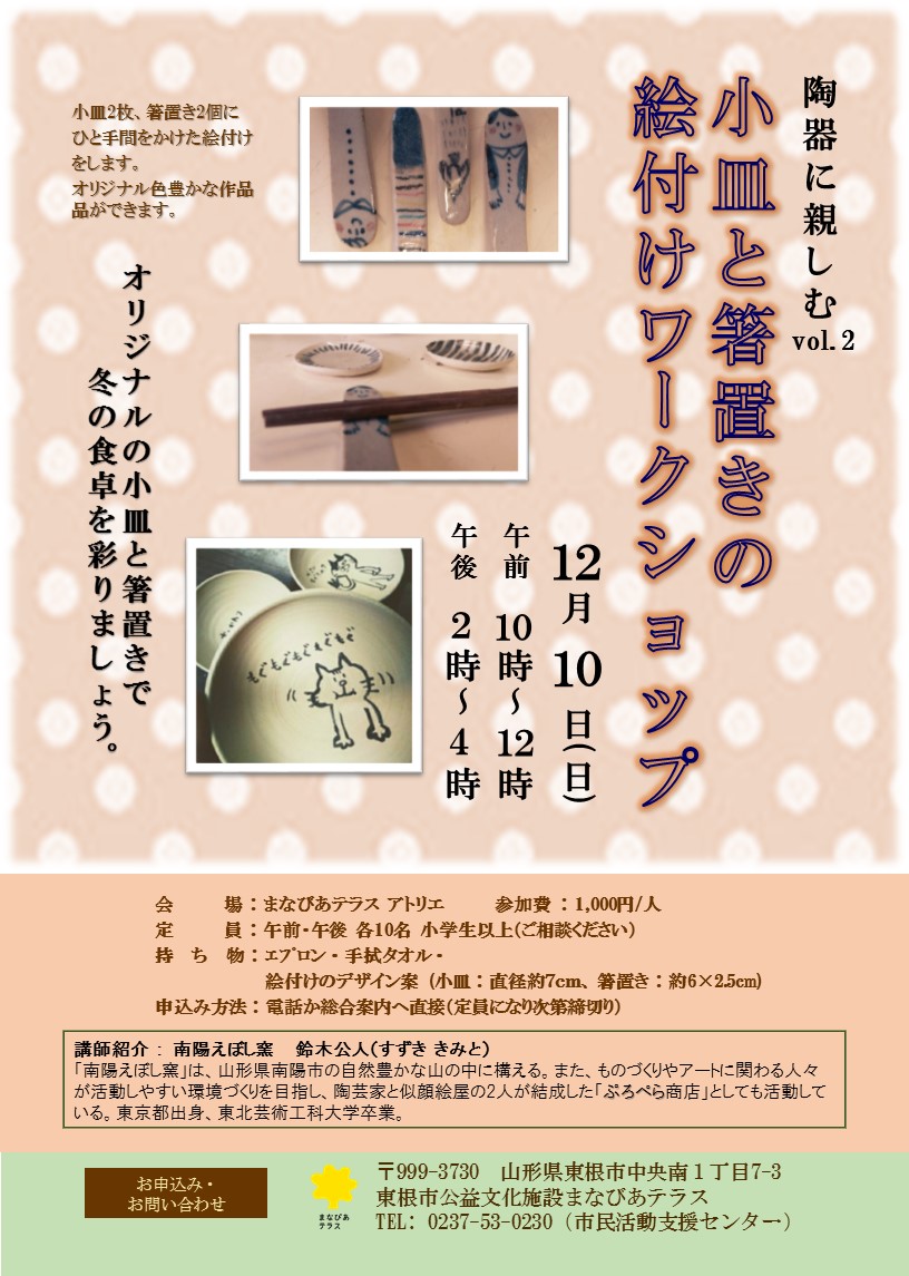 持 ち 物 : エプロン・手拭タオル・絵付けのデザイン案(小皿:直径約7cm、箸置き:約6x2.5cm)