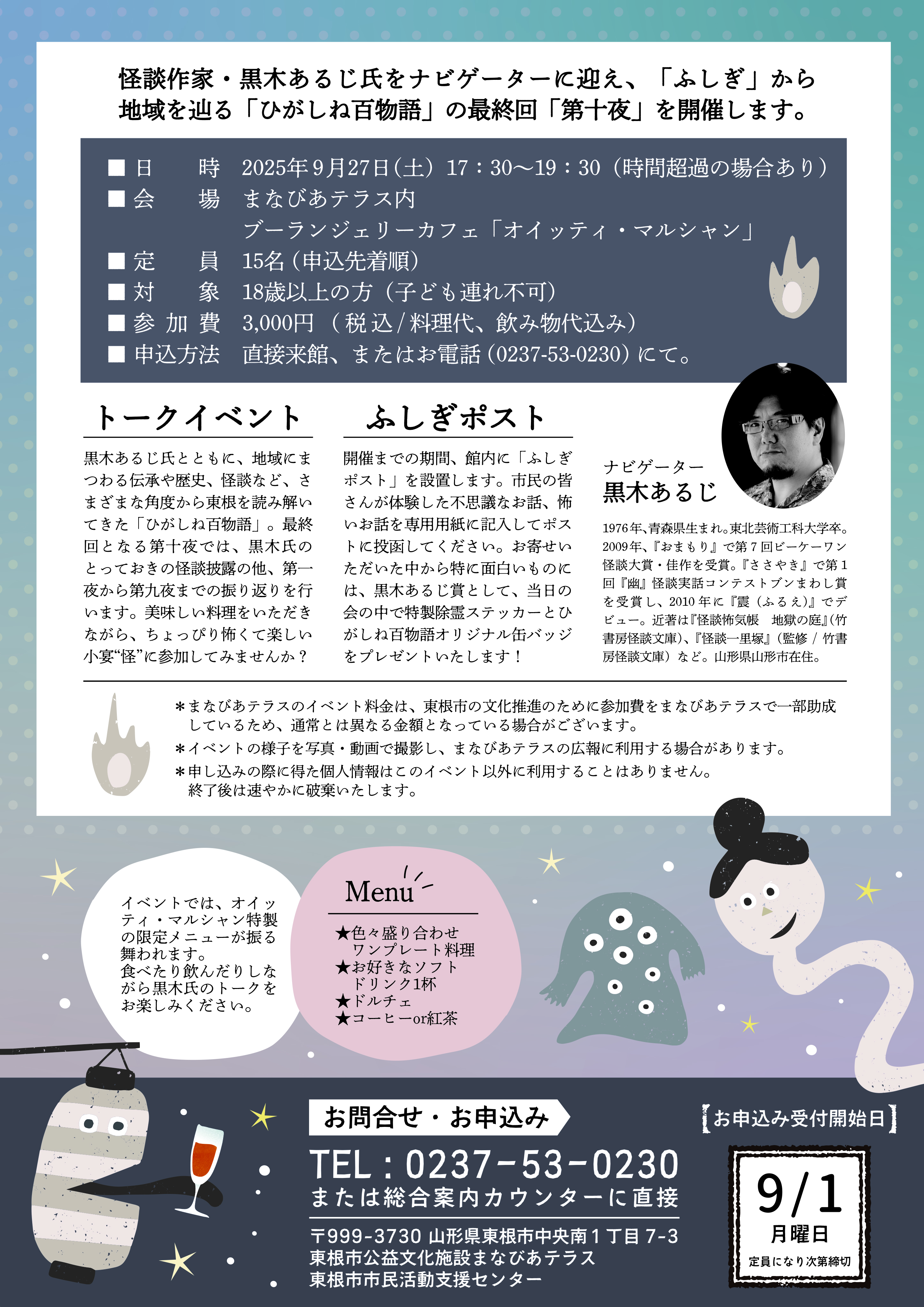 黒木あるじ氏とともに、地域にまつわる伝承や歴史、怪談など、さまざまな角度から東根を読み解いてきた「ひがしね百物語」。最終回となる第十夜では、黒木氏のとっておきの怪談披露の他、第一夜から第九夜までの振り返りを行います。美味しい料理をいただきながら、ちょっぴり怖くて楽しい、小宴“怪”に参加してみませんか?