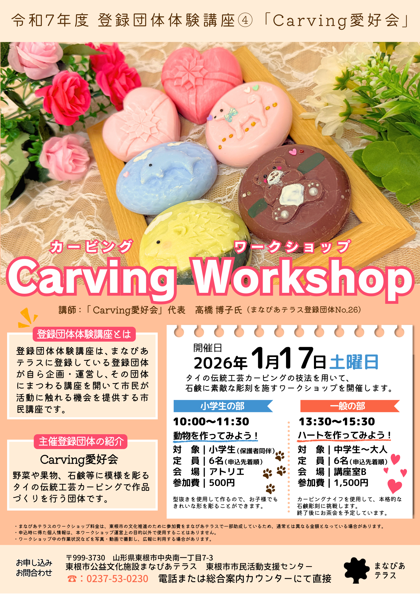 令和7年度登録団体体験講座の4回目は、Carving愛好会代表の高橋博子氏によるカービングワークショップを行います。2つの区分に分かれたコースで、子供も大人も楽しく石鹸彫刻に触れることができます!皆様ぜひご参加ください!