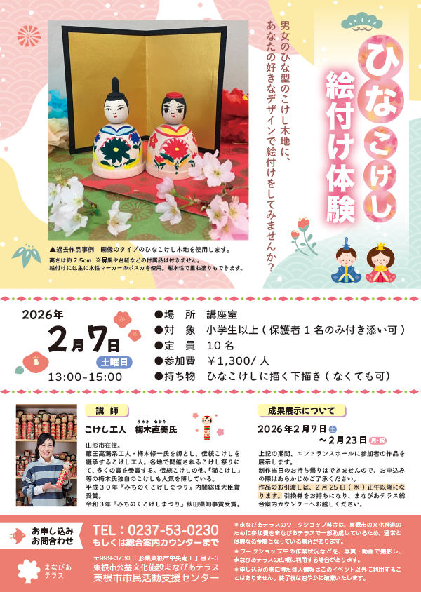 ワークショップで制作したひなこけしは、2月7日(土)~23日(月・祝)の期間中、まなびあテラス・エントランスホールにて展示いたします。